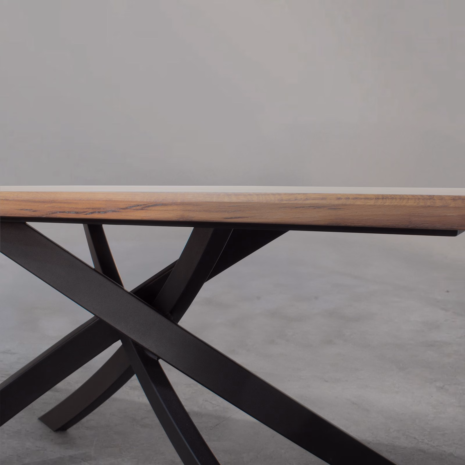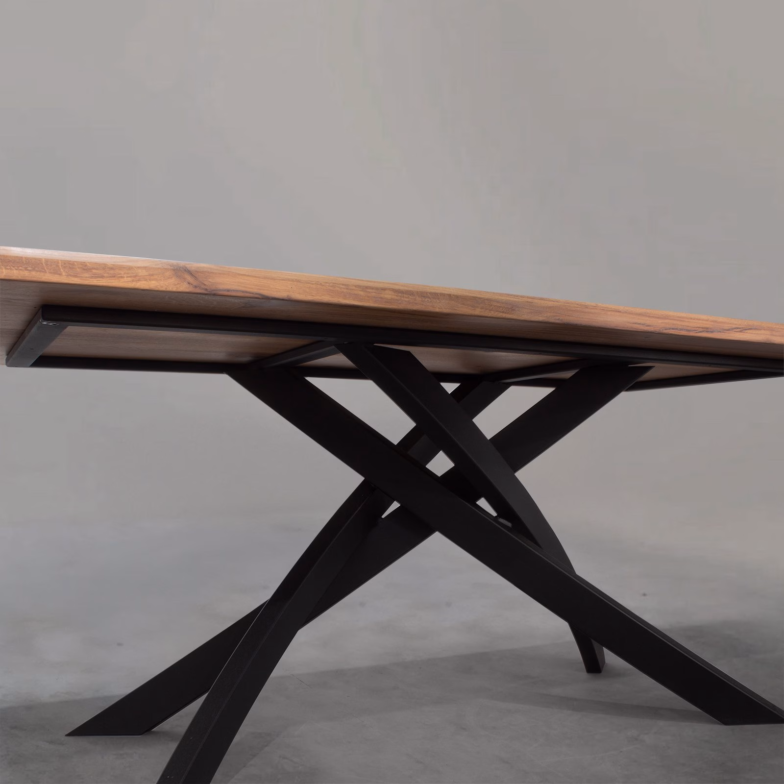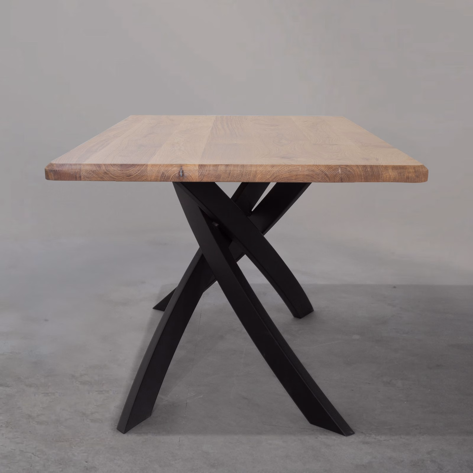 Trpezarijski sto Twisten odlikuje se masivnom drvenom pločom i dinamično zakrivljenim metalnim nogama koje stvaraju snažan vizuelni utisak. Spoj elegancije i stabilnosti, idealan je za moderne enterijere sa karakterom.